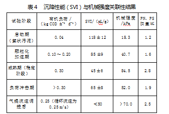 污泥体积指数(SVI)与机械强度(MS)协同演变揭示颗粒稳定性的内在调控机制,如表4所示。试验表明,SVI由初始絮状污泥的118 mL/g±12 mL/g逐步降至45 mL/g±6 mL/g(成熟期),且与机械强度呈显著负相关(R2=0.91)。机械强度提升(从18.3 kPa增至84.5 kPa),主要归因于胞外聚合物(EPS)中蛋白质(PN)/多糖(PS)质量比的优化(1.2→2.8):高PN/PS质量比促进疏水基团交联,增强颗粒抗剪切能力,而β-多糖刚性骨架则通过氢键网络提升结构完整性。当有机负荷>0.3 kg COD/(m3·d)时,SVI异常升高至65 mL/g(机械强度下降至52 kPa),主要因蛋白酶活性激增(提升2.1倍)导致PN过度水解。气提循环流速(0.15→0.25 m/s)的梯度调控可使剪切力与EPS再生速率动态平衡,维持SVI<50mL/g(机械强度>70kPa)。多元回归分析表明,机械强度每提升10 kPa,SVI可降低约8.5%。