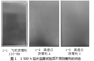 经过测试,飞机防腐剂CIC-RH耐中性盐雾的性能达到了相应的标准要求(BMS 3-35),如图1所示。涂覆有飞机防腐剂CIC-RH的铝合金测试板,在经过1 500 h的中性盐雾测试后,测试板表面未见腐蚀。测试的进口防腐剂A和进口防腐剂C也可通过1 500 h的中性盐雾测试。
