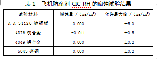 在飞机防腐剂施工过程中,防腐剂不可避免地会与飞机上的多种金属材料发生接触,一般来说,用于飞机制造的金属材料本身都有较好的防腐蚀性能。分别采用A-A-51126镀镉板、SAE AMS 4049铝合金、AMS 4376镁合金和AMS 5045碳钢进行质量变化腐蚀试验,结果如表1所示。飞机防腐剂CIC-RH对4种航空金属材料的腐蚀量均低于允许值,由此可知,飞机防腐剂CIC-RH具有良好的防腐蚀效果。