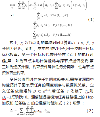 调度决策变量为二值变量xij∈{0,1},若任务Ti被调度至节点Ri,则xij=1,否则为0。调度结果需保证每个任务唯一绑定一个执行节点,同时不超出节点的资源容量。系统性能目标由三部分构成,即平均延迟、系统能耗与经济成本。三目标函数通过加权系数组合成统一的优化目标,用于整体调度性能评估。调度问题表达式如式(1)所示: