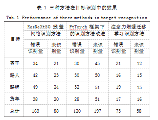 由表1可知,引入注意力机制的注意力增强迁移学习识别方法在各类目标识别上的错误识别量和未识别量都明显低于改进ResNeXt50残差网络识别方法和改进PtTorch框架下的识别方法,表明人工智能及注意力机制在复杂背景目标识别中具有明显的应用优势。