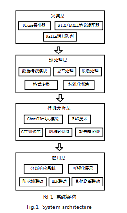 系统遵循模块化、高兼容、可扩展原则,构建“采集-处理-分析-应用”四层架构(如图1所示),核心依托大模型的语义理解与关联推理能力,实现威胁情报分析的全流程自动化。