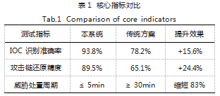本次测试参照GB/T 42583-2023技术规范,基于MISP公开情报、APT攻击模拟用例及企业真实日志构建测试集,重点验证系统核心能力。核心效能指标与传统方案的对比如表1所示,数据可直观反映本系统的性能优势。