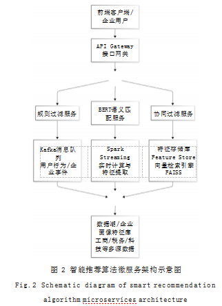 在二期系统中,推荐算法以可扩展的微服务架构进行工程化部署。平台采用Spring Boot作为服务容器,通过Kubernetes进行容器化编排,实现算法服务的弹性伸缩。数据处理层引入Spark与Kafka组合形成实时数据管道:Kafka负责用户行为与企业事件的高吞吐采集,Spark Streaming对流数据进行增量计算、特征提取与画像更新,并以毫秒级延迟写入特征存储库(Feature Store)。在画像建模接口中,系统基于统一特征描述协议(UFDL)对工商、税务、科技等多源数据进行Schema对齐、Embedding转换与ID映射;特征结果存入数据湖并被向量检索引擎FAISS调用。匹配服务层采用多模型并行推理框架,其中规则过滤模块、BERT语义匹配模块与协同过滤模块以独立微服务运行,通过gRPC实现低延迟组合调用。融合建模由加权集成器完成,并通过学习排序引擎(XGBoost/LambdaMART)输出排序结果[5]。最终推理结果经API Gateway返回前端,实现高并发下的实时、个性化政策推荐。智能推荐算法微服务架构示意图如图2所示。