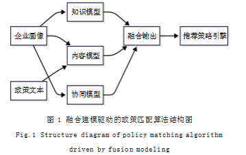 该框架集成了基于规则、基于内容(内容推荐)与基于协同过滤的多类模型[3],其中规则模型负责硬性约束条件(如行业门类、注册地、企业规模等)的过滤;内容模型通过NLP语义理解实现政策与画像的向量化表达与相似度计算;协同模型则通过用户行为数据挖掘“相似企业—相似政策”的隐含联系,实现潜在推荐的拓展与补充。三类模型输出经加权融合后构成最终匹配推荐集合。算法结构图如图1所示。