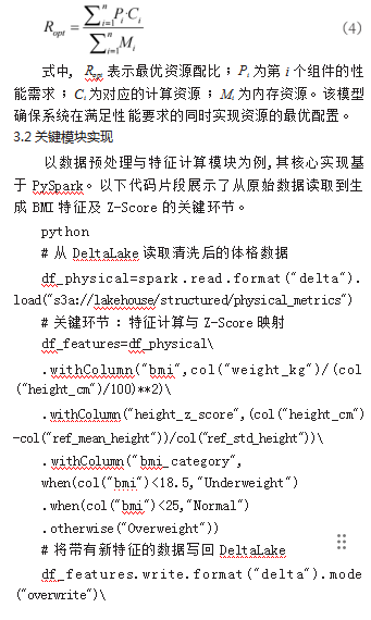 录。例如,对于身高体重数据,采用基于分位数的异常检测方法,将超出合理生理范围的记录标记并予以修正或剔除。(2)数据转换与标准化,将不同来源的数据映射到统一的业务模型,并将单位统一为国际标准单位。此阶段还会进行初步的特征工程,例如,计算身体质量指数(BMI),其计算公式如式(1)所示: