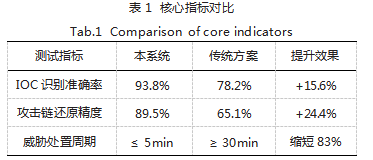 本次测试参照GB/T 42583-2023技术规范,基于MISP公开情报、APT攻击模拟用例及企业真实日志构建测试集,重点验证系统核心能力。核心效能指标与传统方案的对比如表1所示,数据可直观反映本系统的性能优势。
