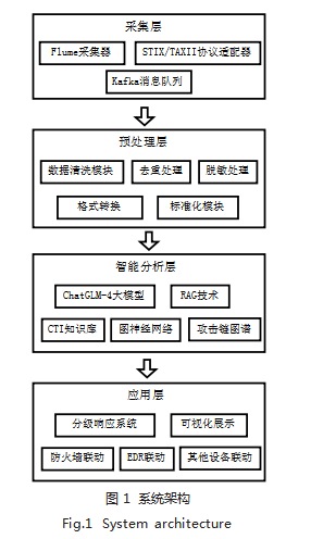 系统遵循模块化、高兼容、可扩展原则,构建“采集-处理-分析-应用”四层架构(如图1所示),核心依托大模型的语义理解与关联推理能力,实现威胁情报分析的全流程自动化。
