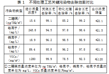 关键污染物去除效率实验用连续运行180 d中试规模装置来验证,实验选取二噁英重金属离子和挥发性有机物作目标污染物且建立完整检测分析体系,如表1所示。