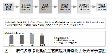 废气多级净化系统运用旋风分离加急冷塔加湿法脱硫加活性炭吸附组合工艺,以此实现对颗粒物、酸性气体和有机污染物协同去除,如图1所示。
