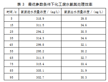 为明确优化参数对废水处理的实际作用,本研究模拟实际进水工况,设定温度为28℃、pH值为6.5~7.5,开展化工废水95 d驯化实验,追踪污染物降解速率变化,结果如表2、表3所示。当进水COD值为1 200 mg/L时,处理后的出水COD值为200 mg/L,处理效率达83.3%,较优化前提升16.6%。氨氮质量浓度约300 mg/L时,处理后的出水质量浓度为35 mg/L,降解效率达88.3%,较优化前高21.3%。这表明优化参数能显著提升污泥微生物的协同代谢能力,加快污染物降解速度,有效降低出水污染物质量浓度,为工艺高效运行提供关键支撑。
