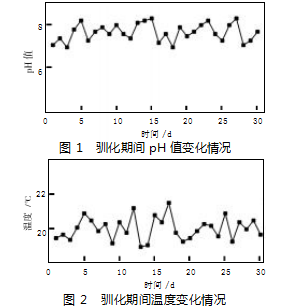 在污泥驯化阶段,该化工废水培养初期3 d内微生物对污染物的降解效率最高。因此,确定以3 d为一个周期开展连续驯化实验。污泥驯化实验期间,每3 d向驯化好的活性污泥中加入按浓度梯度稀释的废水,并移除同体积原废水。同时,通过空气泵持续为活性污泥供氧,连续运行30 d。稳定运行一个月后,对水质进行检测。结果显示,进水COD值约1 200 mg/L,出水COD值超400 mg/L,处理效率为66.7%。氨氮进水质量浓度约300 mg/L,出水质量浓度达99 mg/L左右,降解效率为67.0%。COD出水质量浓度、氨氮出水质量浓度均未达到排放标准,需要对运行参数进行优化,以提升处理效果。原始运行参数如图1、图2所示,可以看出,30 d运行周期内温度在21℃左右波动,水质pH值在7.5~8.5范围内。在该参数环境下,未能充分激活微生物的代谢活性。因此,亟需进行优化调控。