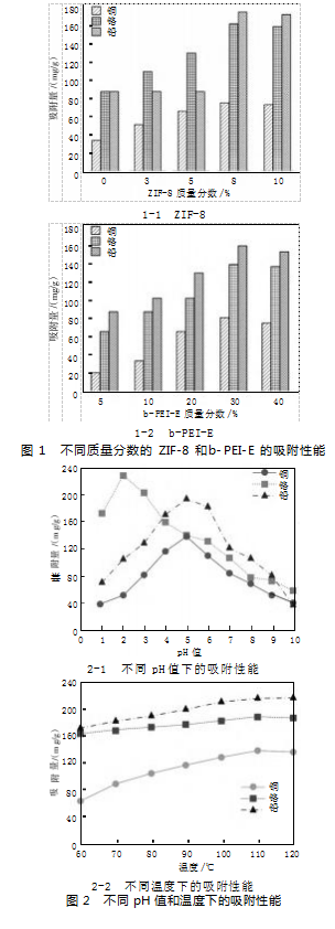 不同质量分数的ZIF-8和b-PEI-E对重金属离子的吸附性能如图1所示。从图1中可以看出,随着ZIF-8质量分数的增加,三种重金属离子的吸附量呈现上升趋势。然而,当ZIF-8质量分数达到10%时,吸附量出现了一定的下降。这表明,ZIF-8质量分数为8%时最为合适。此时,铜、铬和铅三种金属离子的吸附量达到最大值,分别为75.05、161.58、174.98 mg/g。当b-PEI-E质量分数为30%时,三种金属离子的吸附量最大,此时铜、铬和铅的吸附量分别为80.64、139.46、159.82 mg/g。可以看出,对ZIF-8和b-PEI-E质量分数进行优化,对于提高重金属吸附性能具有显著作用。