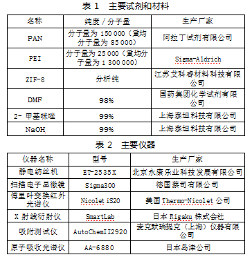 实验中使用的主要化学试剂和材料包括PAN、聚乙烯亚胺(Polyethyleneimine,PEI)、环己烯胺(Cyclohexene oxide,Epoxy)、沸石咪唑酯骨架-8(Zeolitic Imidazolate Framework-8,ZIF-8)和N,N-二甲基甲酰胺(N,N-Dimethylformamide,DMF)等,如表1所示。主要的实验仪器设备包括静电纺丝机、场发射扫描电子显微镜、傅里叶变换红外光谱仪以及X射线衍射仪等,如表2所示。