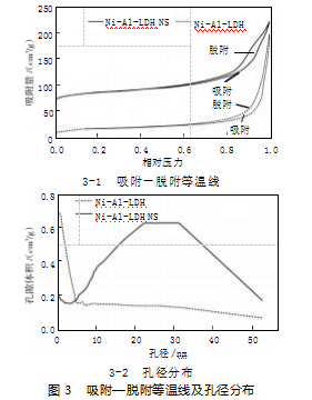 由图2-1可知,相较于Ni-Al-LDH,Ni-Al-LDH NS在1 357 cm-1处的波峰明显减弱,且Ni-Al-LDH-NS中Ni-O-Ni键和Ni-O-Al键的振动峰向低波数方向移动。这是因为Ni-Al-LDH-NS层间硝酸根减少,且剥离后影响了M-O键,导致碱性降低。由图2-2可知,相较于Ni-Al-LDH,Ni-Al-LDH NS的层状面特征衍射峰消失,表明其结构可能被破坏。同时,两类材料的层间距在吸附乙硫醇前后没有变化。由此可知,乙硫醇并未进入层间,而是在材料外表面进行吸附。样品的吸附-脱附等温线及孔径分布如图3所示。