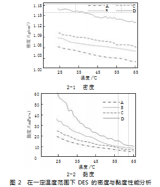 在一定温度范围下DES的密度与黏度性能分析如图2的示。其中,A方案为研究提出的有四甲基胍和乙二醇制备的DES,B方案为用1,8-二氮杂环[5,4,0]十一烯-7和乙二醇制备的DES,C方案为由1,5-二氮杂双环[4.3.0]-5-壬烯和乙二醇制备的DES,D方案为由乙酰胍和乙二醇制备的DES。由图2可以看出,所有方案的DES密度随着温度的增加而下降。其中,A方案的DES密度最小,在65℃温度下密度为1.02 g/cm3。所有DES的黏度随着温度增加而下降,其中,A方案的黏度下降较小,黏度也最低。