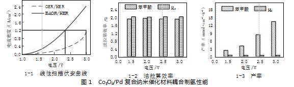图1-1为无膜流动电解槽中BAOR/HER体系及OER/HER体系的线性扫描伏安曲线;图1-2和图1-3为BAOR/HER体系中苯甲酸和H2的法拉第效率及产率数据。由图1可知,在1.2 A/cm2电流密度下,Co3O4/Pd复合纳米催化材料制氢系统仅需2.43 V的工作电压。且该系统H2的法拉第效率接近理论最大值(100%),同时苯甲酸的平均法拉第效率也高达93.64%。当工作电压提升至3.0 V时,研究系统表现出了优异的产物生成速率,苯甲酸和H2的产率分别达到了13.06 mmol/(cm2·h)和0.68 mmol/(cm2·h)。由此可知,研究所制备的Co3O4/Pd复合纳米催化材料不仅能够有效降低电解水制氢的能耗,还能够高效驱动BAOR,实现高附加值产物(苯甲酸)和H2的协同生成。
