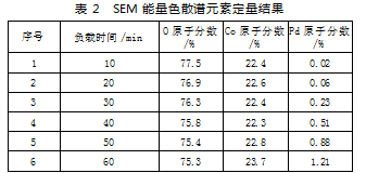 为了证明Pd纳米颗粒成功负载于Co3O4纳米棒表面,研究首先采用扫描电子显微镜(Scanning Elec tron Microscope,SEM)能量色散谱对所制备的Co3O4/Pd复合纳米催化材料进行了表征分析。SEM能量色散谱元素定量结果如表2所示。