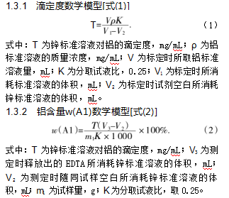 加入乙酸-乙酸钠缓冲溶液可以将溶液pH稳定在4.0~5.0,加入二甲酚橙指示剂,用锌标准溶液滴定过量的EDTA溶液。与铝完全络合的EDTA被氟化钠的取代后,再用锌标准溶液滴定至溶液呈紫外色。