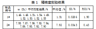 1#样品采用方法比对来验证正确度如表2,ICP测试结果与本方法测试结果一致性较好;2#样品则通过加标回收来验证正确度,经测试回收率为100.16%,实验结果准确性高。
