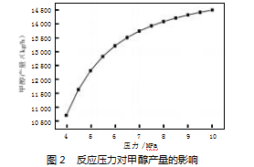 由图2可知,随着反应压力的增加,甲醇产量呈现上升的趋势,且趋势逐渐变缓。考虑到高压状态下设备可靠性下降等因素,选择反应压力为6 MPa。