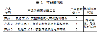 本次试验采用产品进行相关的试验,分别采用一种现行工艺和两种改进工艺进行试验,试验的产品编号、表面处理工艺名称、产品的数量见表1。