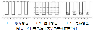 铝合金材料由于具有密度低、耐蚀性能佳、塑性好等优点[1],被广泛应用于国防工业、航空航天等领域。目前铝合金应用最广泛的表面处理技术为阳极氧化。阳极氧化膜层由于具有多孔性和吸附性,可以通过着色技术,形成不同的颜色外观,根据着色基体的显色基体存在的位置不同,阳极氧化膜着色可以分为三类[2]:吸附着色法、整体着色法、电解着色法,如图1所示。