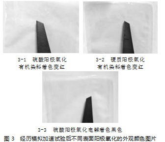 观察经过模拟加速试验后,使用三种阳极氧化工艺的产品的外观颜色差异,发现现行工艺硫酸阳极氧化有机染料着色、改进工艺1硬质阳极氧化有机染料着色,产品外观出现了颜色变红的现象,而改进工艺2硫酸阳极氧化电解着色,外观颜色仍然呈现黑色,没有出现变色的现象,产品试验后的外观图片如图3所示。