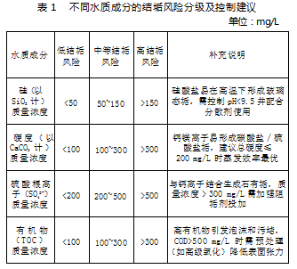 废水中含有高浓度的有机物,这些有机物在蒸发过程中容易形成黏稠的污垢层,附着在蒸发器内壁和管道上,影响蒸发器的换热效率。同时,有机物还会与无机盐结合形成复杂的化合物,进一步加剧结垢现象。为了更直观地了解水质成分对结垢程度的影响,如表1所示,可以清晰地看出,随着废水中硅、硬度、硫酸根离子和有机物含量的增加,结垢程度呈现明显上升趋势[2]。