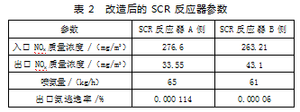 对燃烧器改造及优化燃尽风配置后,启动机组满负荷运行对反应器相关参数进行观察,反应器入口的氮氧化物质量浓度从原先的600 mg/m3以上降低至约300 mg/m3,出口氨逃逸率也基本控制在0.000 3%以内,单侧喷氨量稳定在约50 kg/h。预计可以降低50%的耗氨量,按照目前液氨4 700元/t的价格,全年累计可节约耗氨量1 351 t,全年累计可以节约费用635余万元。由此可见,改造效果显著。开机后的情况,如表2所示: