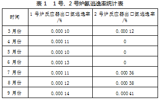 为满足电网对并网机组深度调峰的需求,2号机组已历经3个月的宽负荷改造。在深度调峰期间,SCR反应器的入口烟气温度可能降至310℃以下,这将导致还原反应效率下降,并增加氨逃逸现象。因此,通过增设省煤器烟气旁路,将省煤器入口的烟气引导至脱硝入口,以确保脱硝烟气温度能够满足还原反应的正常进行。改造完成后,通过对近3个月的氨逃逸率数据进行统计分析后SCR反应器出口氨逃逸率明显高于1号炉,一直高于设计值0.000 3%。氨逃逸率数据,如表1所示。