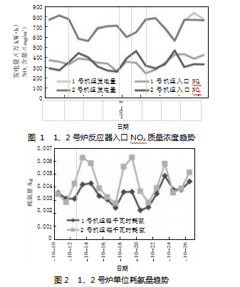 上述图表中只统计了抽样的部分数据,从中可以看出,两台机组的日发电量基本一致,对应下的2台机组反应器入口的NOx的含量基本差别不大,但脱硝的耗氨量2号机组的反应器要比1号机组的大。