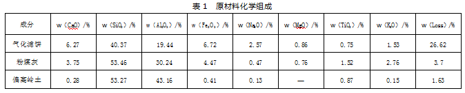实验选用的原材料主要有气化滤饼、粉煤灰以及偏高岭土。其中,气化滤饼和粉煤灰来自宁夏宁东地区某公司排放的气化滤饼和循环流化床粉煤灰,比表面积分别为55.4 m2/g和34.24 m2/g。偏高岭土来自于内蒙古某公司生产的高活性偏高岭土粉,比表面积为82.83 m2/g,气化滤饼、粉煤灰、偏高岭土化学组成如表1所示。气化滤饼的重金属元素浸出浓度参照《地表水环境质量标准》(GB 3838—2002),可以看出,气化滤饼中砷、铬、镉、铅、铜均超过了标准限值,其中,镉超标250倍,铅超标近40倍。