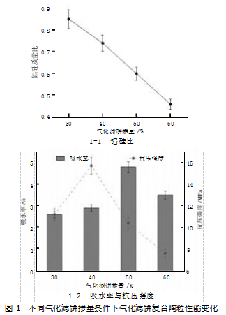 1)气化滤饼复合陶粒吸水率和抗压强度随气化滤饼掺量增加呈先增大后降低的趋势,掺量为40%,性能最优。煅烧温度越高,复合陶粒强度越高,吸水率越小。延长煅烧时间可适当降低煅烧时间。