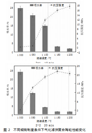 对比不同煅烧时间发现,延长煅烧时间可一定程度降低煅烧温度。实验条件下,气化滤饼复合陶粒烧成温度1 100℃煅烧10 min与1 050℃煅烧20 min条件下,抗压强度基本相当,但1 050℃煅烧20 min条件下制备的陶粒吸水率要低于1 100℃煅烧10 min。