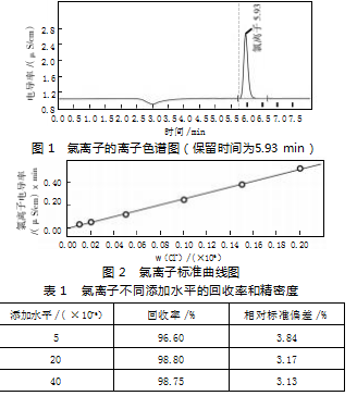 使用5×10-6、20×10-6、40×10-6氯标准溶液进行系统燃烧效率、吸收液吸收效率和离子色谱测试效率的验证。将3个浓度水平的氯离子标准溶液分别投入已经烧至恒重的石英舟中,为了减少石英舟的损耗,可在石英舟上垫一张石英纸。使用自动进样系统,每个浓度测试6次,计算空白回收率和相对标准偏差(RSD)。由表1可知,氯离子的平均回收率为96.60%、98.80%、98.75%,RSD值分别为3.84%、3.17%、3.13%,符合检测要求。