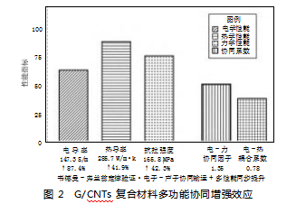 G/CNTs复合材料展现出显著的多功能协同增强效应,电导率与力学性能的协同因子达到1.35,表明两种功能的相互促进作用(见图2),热学性能测试显示复合材料热导率为285.7 W/(m·K),电-热耦合系数为0.78,验证了韦德曼-弗兰兹定律的适用性。微观机制分析表明石墨烯提供二维载流子传输平台,碳纳米管构建一维快速传输通道,两者协同构建了高效的电子-声子输运网络,界面相互作用不仅优化了载流子散射机制,同时增强了声子传输效率实现了电-热-力多性能的同步提升[5]。