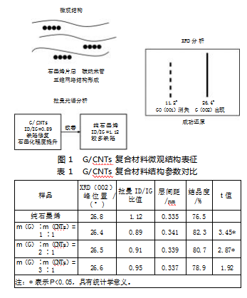 FESEM与TEM观察显示G/CNTs复合材料中石墨烯片层与碳纳米管形成良好的三维网络结构,碳纳米管均匀分散在石墨烯基体中并与片层边缘紧密接触(见表1),XRD分析(见图1)表明氧化石墨烯的(001)衍射峰从11.2°消失,石墨烯(002)峰出现在26.4°证实成功还原。拉曼光谱显示复合材料的ID/IG比值为0.89较纯石墨烯(1.12)显著降低,表明碳纳米管的加入有效修复了石墨烯缺陷结构提升了材料的石墨化程度与结构完整性。