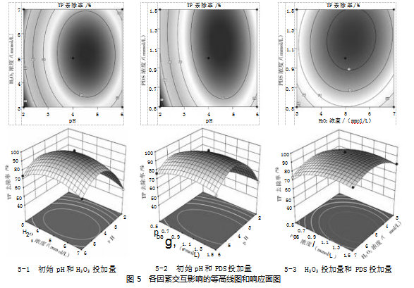3)双因子交互效应分析。对表3的数据进行降维分析,利用Design-Expert 10.0.1软件对初始pH、H2O2投加量以及PDS投加量两两因素对TP去除率的影响进行分析,得到响应面和等高线图如图5所示。等高线可直观地反映两两因素之间交互作用的显著情况,越倾斜椭圆状则交互作用越明显[23]。由图5-1可知,溶液初始pH和H2O2投加量对TP去除率的影响呈抛物面分布,曲面纵向跨度较大且等高线呈椭圆形,当H2O2投加量一定时,TP去除率随着溶液初始pH值的增大而增大,当溶液初始pH在3.5~5.5之间时,TP去除率都能达到90%左右,认为初始pH和H2O2投加量的交互作用显著,这是因为较低的溶液pH值更有利于Fenton氧化技术反应的进行[24]。图5-2为H2O2投加量一定的条件下,溶液初始pH值和PDS投加量对TP去除率的影响。在研究范围内,TP去除率随pH值的增加先增大后减小,在初始pH为4.0左右达到最大值,且等高线呈椭圆形,陡峭的响应曲面表明初始pH和PDS投加量交互作用显著。当初始pH为4.0,在BC因子水平的响应面图和等高线图如图5-3所示:TP去除率随着H2O2和PDS的投加量的增加,均呈现先升高后下降的趋势,当H2O2投加量在4.5~5.5 mmol/L、PDS投加量在0.9~1.1 mmol/L时,TP去除率较高,两者交互作用的响应面陡峭程度相较于其他连个交互作用略平缓,且方差分析也表明两者交互作用不显著。