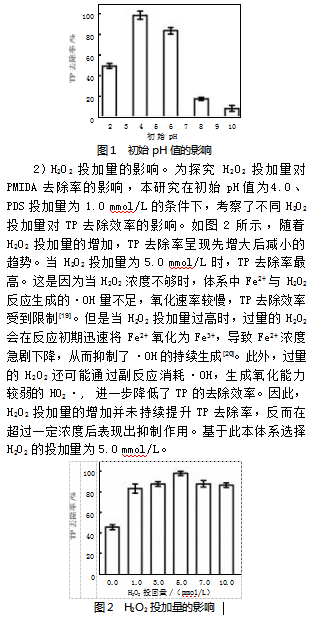 在250 mL烧杯中加入100 mL浓度为1.0 mmol/L(以磷计)的双甘膦(PMIDA)模拟废水,使用酸或碱调节其初始pH值。随后,依次向反应体系中投加七水合硫酸亚铁(FeSO4·7H2O)、过氧化氢(H2O2)和过硫酸盐(PDS),并在磁力搅拌条件下进行氧化降解实验,反应时长设定为60 min。反应结束后,立即采集反应液样品,经0.45μm孔径的微孔滤膜过滤后,采用适当分析方法测定处理效果。为确保数据可靠性,每组实验均设置3个平行样,最终结果取3次重复实验的平均值。