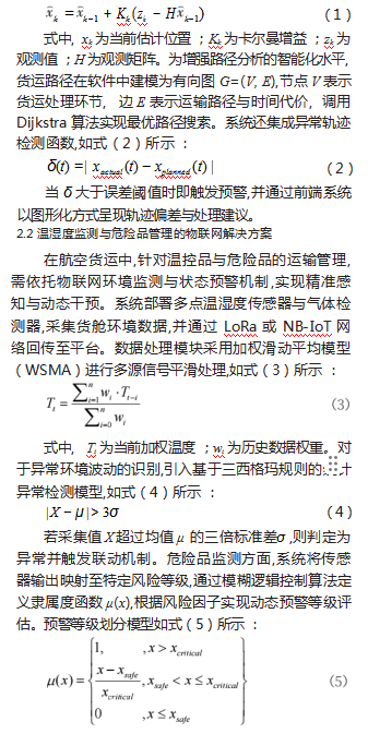 某大型航空公司构建了基于物联网的智慧货运平台,覆盖仓储、调度与客户服务等核心环节。平台部署RFID与UWB设备采集货物状态,利用图模型与Dijkstra算法规划流转路径,并通过LoRa网络上传传感数据[4]。后端结合滑动平均与三西格玛算法实现数据清洗与预警联动,调度系统集成A*算法优化作业路径。平台开放API对接航班系统与客户端,形成感知—决策—反馈的智能闭环,提升货运流程的稳定性与响应效率。