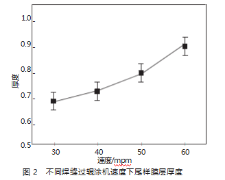 由图2可知,焊缝过辊涂机速度由30mpm增加至60mpm,尾样的厚度呈增加趋势,由30mpm的0.67μm左右增加至60mpm的0.89μm左右。因此,提高焊缝过辊涂机速度至60mpm能明显增加带尾膜厚。