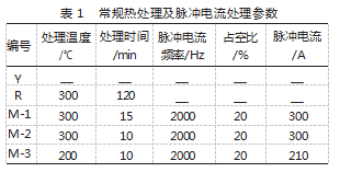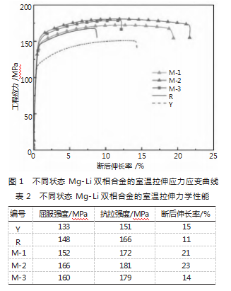 编号Y为原始铸态双相Mg-Li合金;编号R为经过常规热处理的双相Mg-Li合金;编号M为经过脉冲电流处理的双相Mg-Li合金,M-1、M-2、M-3和M-4分别代表不同的脉冲电流参数,常规热处理及脉冲电流处理参数,如表1所示。