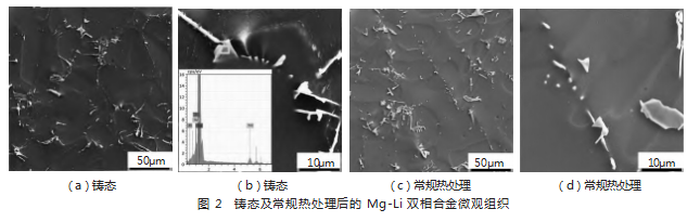 铸态及常规热处理后的Mg-Li双相合金微观组织,如图2所示。