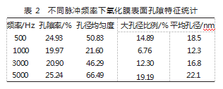 Image J软件定量分析结果表明脉冲频率对氧化膜表面孔隙结构产生显著调控效果。不同频率下的孔隙特征参数如表2所示,1000Hz频率时孔隙率为19.97%显著低于其他频率条件,孔径均匀度用孔径分布方差来进行表征,1000Hz时达到最佳值21.6表明孔径分布相对集中,大孔径比例也就是大于20nm的在1000Hz频率下仅为6.76%有效减少腐蚀离子优势传输通道,高频率条件下大孔径比例明显增加,5000Hz时达到19.19%导致膜层封闭性下降。
