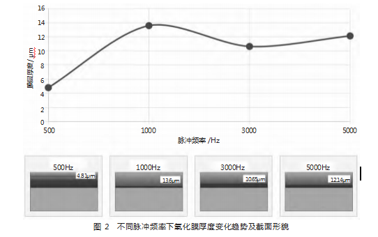 激光共聚焦显微镜测量结果显示膜层厚度随脉冲频率变化呈现规律性特征。如图2所示,膜层厚度在1000Hz频率下达到最大值13.6μm,500Hz,3000Hz与5000Hz频率下的膜层厚度分别为4.81μm、10.65μm与12.14μm,截面SEM观察表明1000Hz条件下形成的氧化膜结构致密均匀,膜层与基体界面结合良好,未发现明显的缺陷或分层现象,500Hz频率下膜层表面生长不均匀,局部区域存在膜层较薄的缺陷,而3000Hz与5000Hz频率下膜层表面出现微裂纹与孔洞,影响膜层的完整性与连续性。