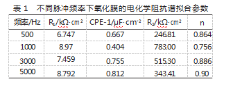 电化学阻抗谱测试结果表明脉冲频率显著影响氧化膜的阻抗特性。不同频率下的阻抗拟合参数情况如表1所示,其中膜层电阻R2能反映氧化膜抵抗腐蚀离子侵入的能力,在1000Hz频率下膜层电阻达到783kΩ·cm2,与500Hz相比提高了大约3.2倍,跟其他频率相比也表现出明显的优势,常相位角元件的n值在1000Hz时为0.756,最接近理想电容的特性,这表明膜层结构相对均匀且致密。