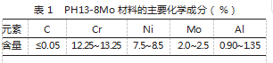 PH13-8Mo(国内对应牌号为0Cr13Ni8Mo2Al)是一类比较典型的高强度马氏体沉淀硬化不锈钢材料,除了力学性能及塑性表现优异之外,还具有卓越的抗腐蚀、加工成形以及焊接等性能。PH13-8Mo材料的主要化学成分,如表1所示,合金元素不同,在调整PH13-8Mo材料性能方面发挥着差异化的作用[4]。