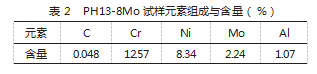 试验所用材料为PH13-8Mo合金试样,是经过真空感应熔炼加真空自耗重熔双重冶炼工艺制备的棒状材料,其元素组成与含量如表2所示。