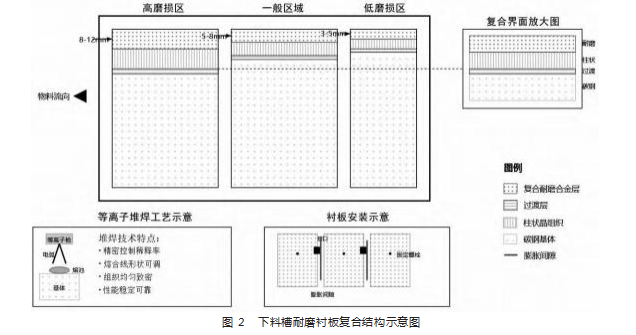 下料槽耐磨衬板作为转炉下料系统的核心易损部件,需长期承受连续物料流动引发的冲蚀磨损与滑动磨损耦合作用,其设计采用多层复合技术,实现耐磨性能与制造成本的协同优化。衬板基体选用普通碳钢来提供结构强度,表面通过堆焊复合耐磨合金层形成主要耐磨保护,如图2所示。